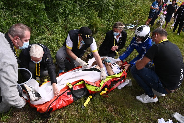 Una de las fotos más impactantes que dejó el accidente fue la del ciclista francés Cyril Lemoine, que debió ser trasladado de urgencia desde la competencia para ser examinado en detalle por los especialistas. El deportista de 38 años terminó con cuatro costillas rotas, un neumotórax moderado y una herida detrás de la oreja que lo obligaron a quedar hospitalizado en la ciudad de Brest.