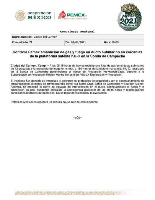«La turbomáquina de las instalaciones de producción activa de Ku Maloob Zaap se vio afectada por una tormenta eléctrica y fuertes lluvias», dice un informe de Pemex al que pudo acceder Reuters, sin mencionar más detalles del análisis. Según la agencia, el incendio pudo controlarse gracias a que la tripulación de la compañía «utilizó nitrógeno» sobre el oleoducto, que sirve para transportar tanto gas como petróleo.
